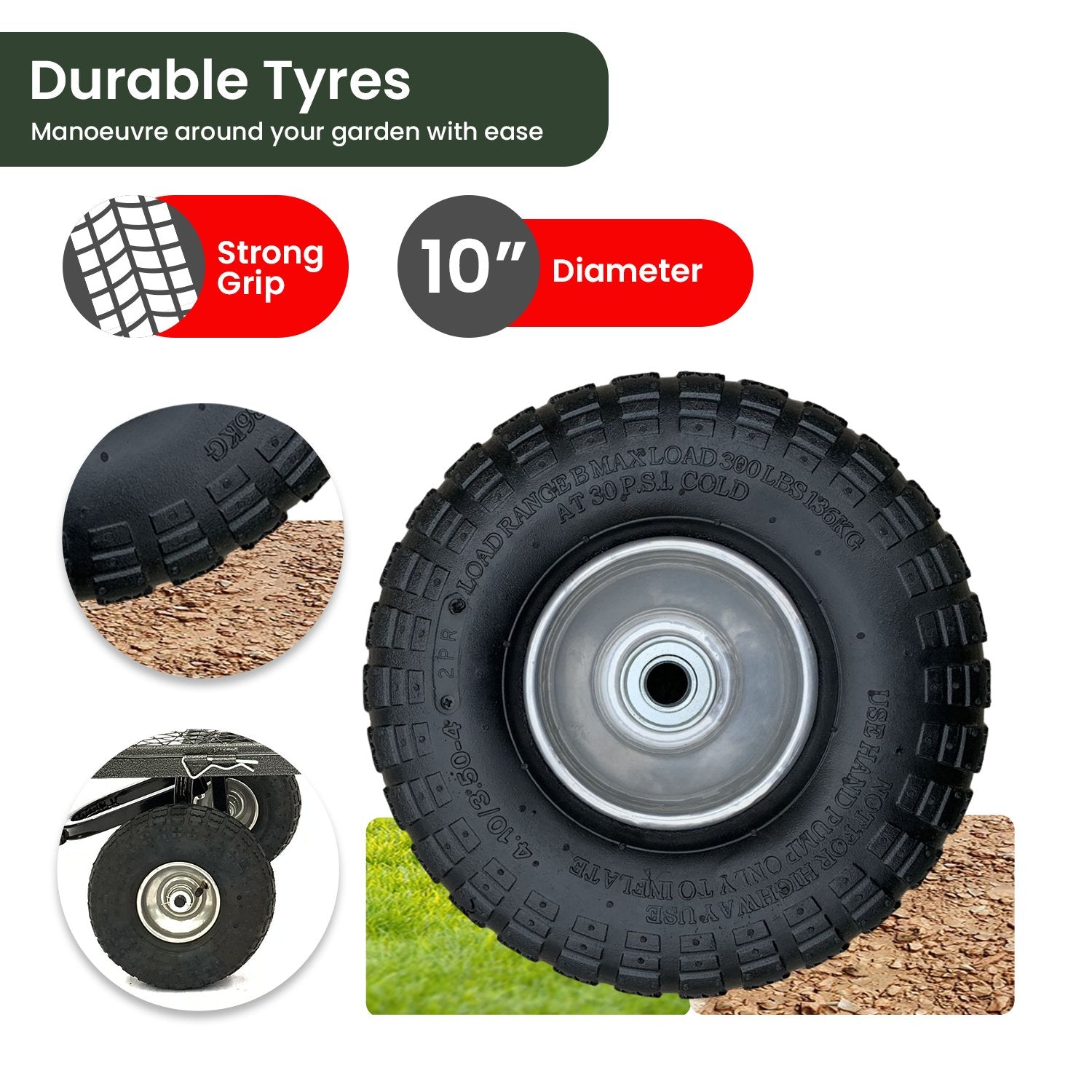 This heavy-duty garden cart makes landscaping jobs so much easier! It has a 300kg max loading capacity and 10-inch pneumatic tyres that can navigate your garden, yard and driveway with ease.